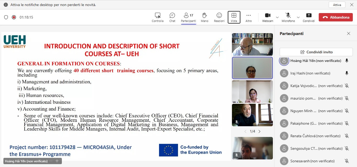 ໃນວັນທີ 24 ເມສາ 2025, ທີມງານຂອງ MICRO4ASIA ພາຍໃຕ້ໂຄງການ Erasmus+ ໄດ້ຈັດກອງປະຊຸມອອນໄລນ໌ຂຶ້ນອີກຄັ້ງ ເພື່ອຕິດຕາມຄວາມຄືບໜ້າ ແລະ ນໍາສະເໜີຫຼັກສູດຝຶກອົບຮົມໄລຍະສັ້ນຂອງ ບັນດາສະຖາບັນການສຶກສາຊັ້ນສູງໃນ ສປປ ລາວ (ລວມມີ ສທຄ) ແລະ ສສ ຫວຽດນາມ.